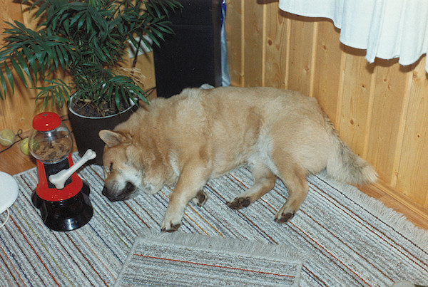 Nach langen 1-2 stündigen Gassigängen, waren die Hunde immer total groggy und schliefen stundenlang, bis es zum nächsten Gassigang ging. Vor Gismos Kopf steht ein Hundefutter-Automat, den jedes Tier bedienen konnte ... selbst die Katzen.