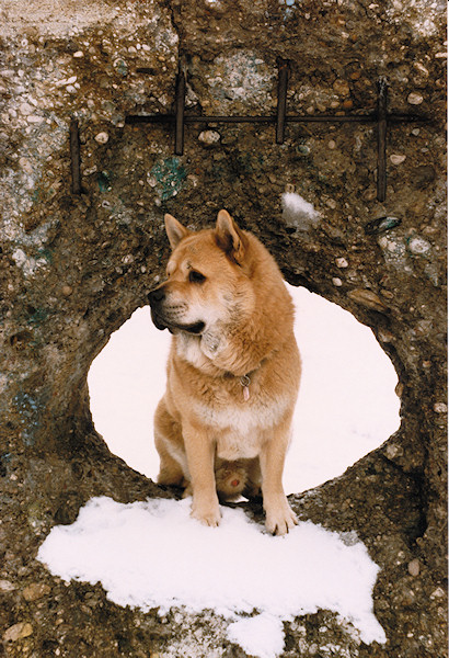 Gismo wurde durch mich sehr gut trainiert und beherrschte sehr viel Kunststückchen. Ich konnte ihn von der Ferne aus navigieren und er wäre auch ein guter Katastrophenhund geworden. Bei dieser Aufnahme, schickte ich ihn um eine von Krieg zerbombte Mauer. In der Mauer ist in der Höhe von ca. 120cm ein Einschussloch von einem eventuellen Panzergeschoss. Als er auf der drüberen Seite an kam und an dem Loch vorbei kam, gab ich ihm das Komando in die Öffnung zu springen und zu bleiben. Dadurch konnte ich diese Aufnahme realisieren.